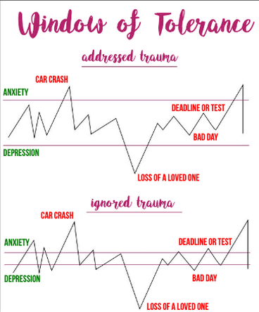 When we experience traumatic events and suppress our emotions without healing ourselves, this window gets smaller! Imagine putting the horizontal lines or the index finger and thumb of the window closer together. That means it’s easier for the line to leave the window, resulting in anxiety or depression. So we’re stuck in those emotions for much longer, it’s harder to stay in the window because now a simple bad day can cause us to feel depression the same way we’d feel the loss of a loved one. It is when we seek help and nurture our wounds that we can help the Window of Tolerance get bigger again.